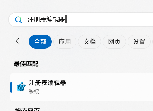 1)按下 Windows + S 进入搜索模式,输入注册表编辑器: