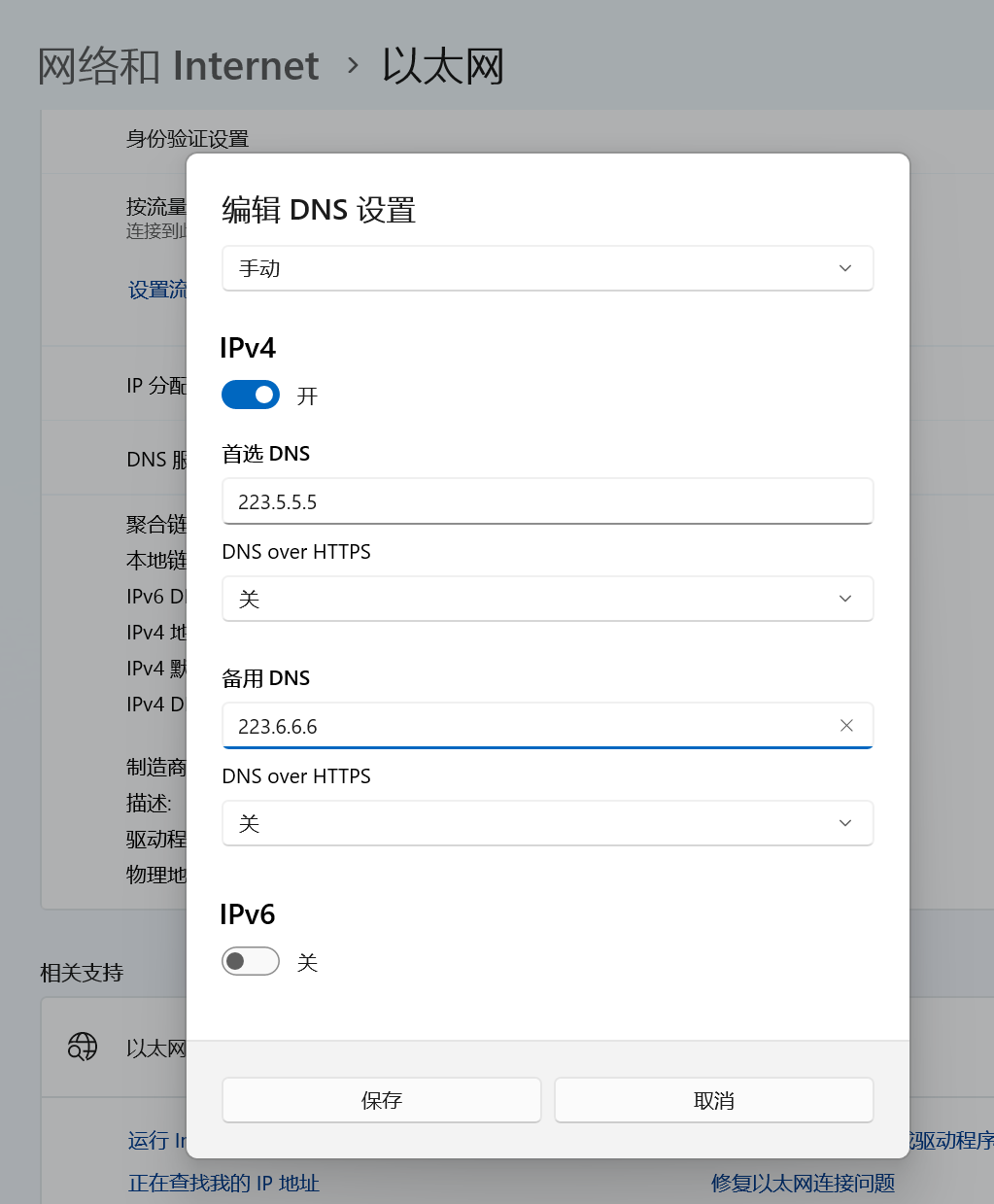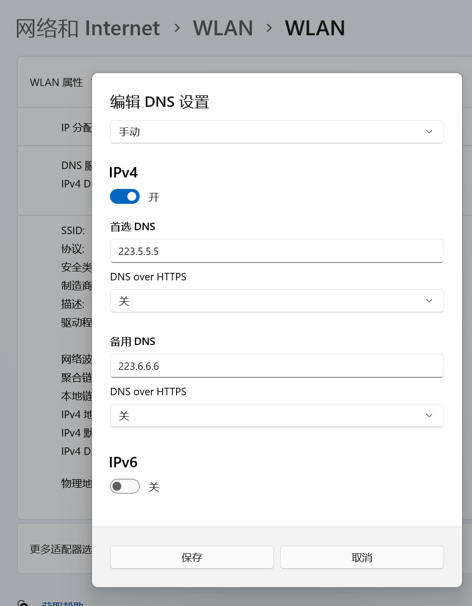 服务器级,配置 DNS 服务器地址。Windows 默认情况下会使用 DHCP 协议来管理 DNS,这在某些情况下很不稳定,可以考虑改为大厂提供的 DNS 服务: