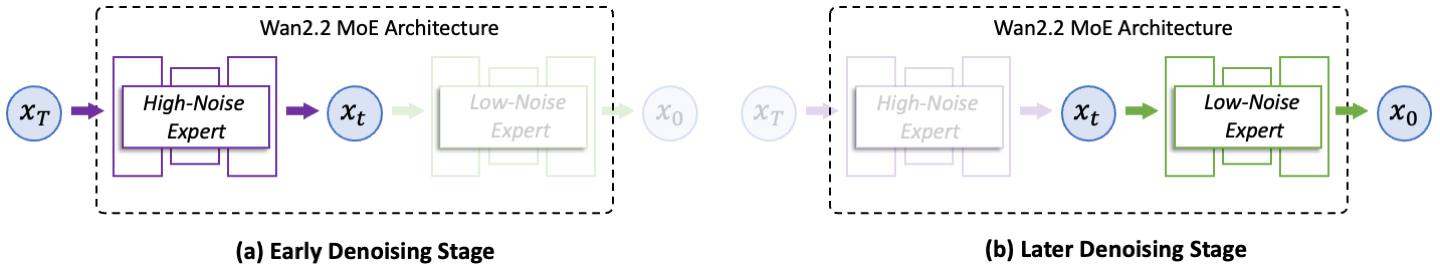 模型架构方面,相较于 Wan2.1,Wan2.2 主要引入了混合专家 (Mixture-of-Experts, MoE) 架构: