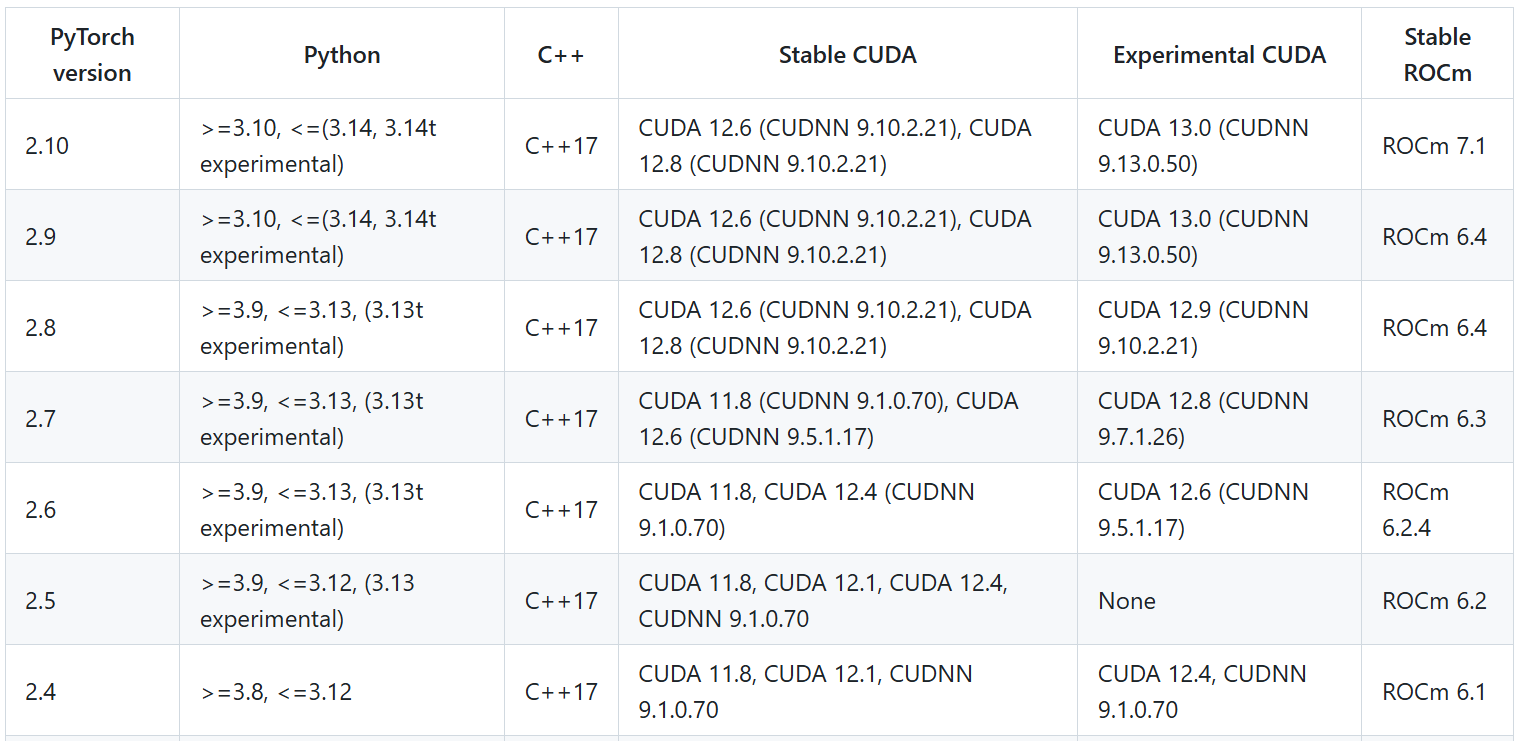 PyTorch、Python 以及 CUDA 的兼容矩阵 :