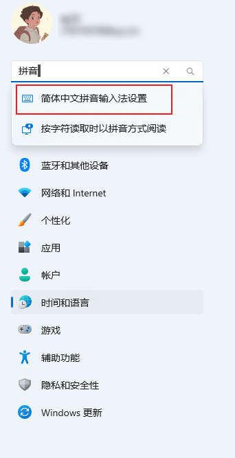 Windows 自带的微软输入法挺好用的,至少不会出现兼容性问题。为了避免不同版本的配置路径可能不同的问题,读者可以直接在设置中搜索「拼音」并选择「简体中文拼音输入法设置」: